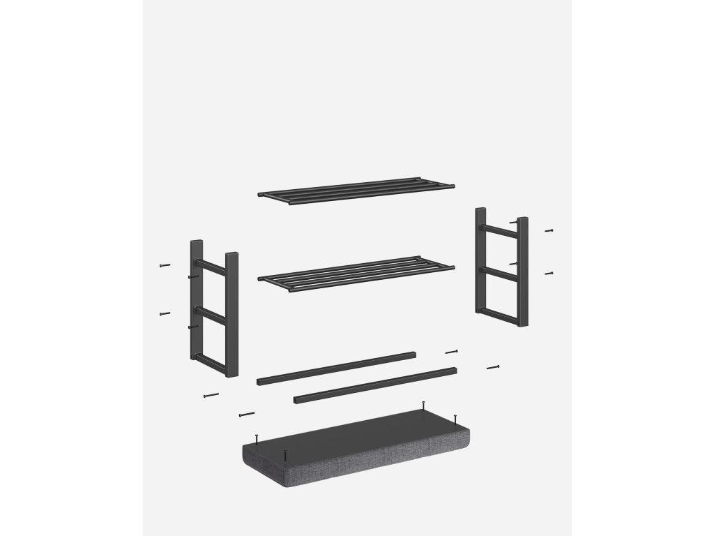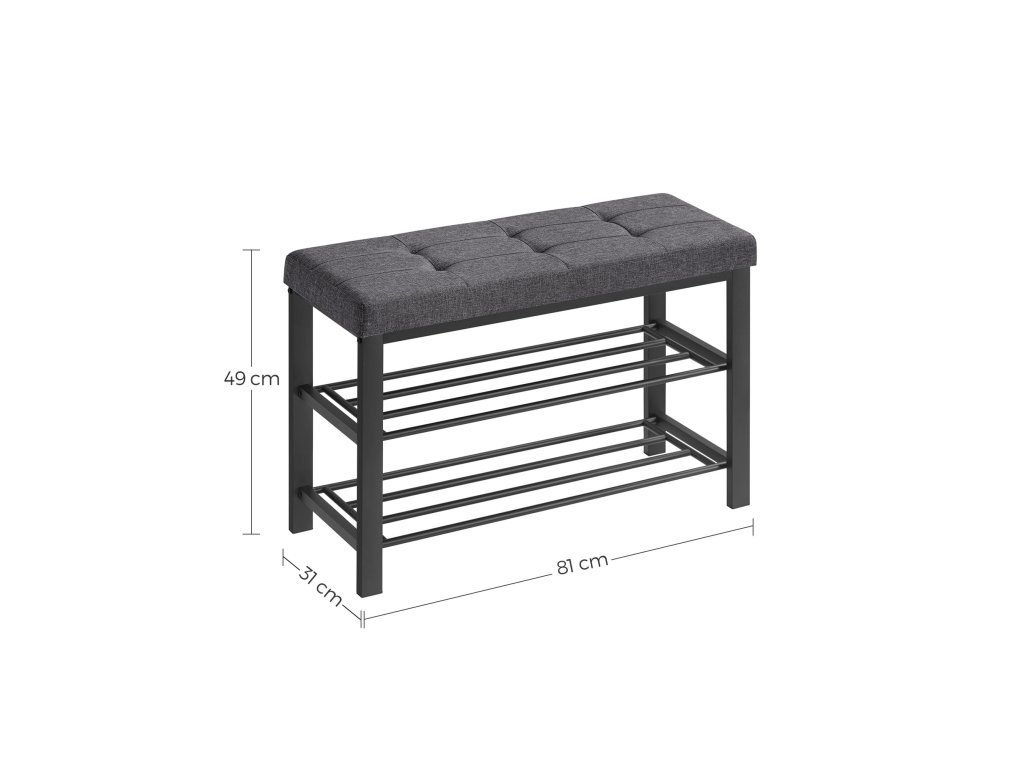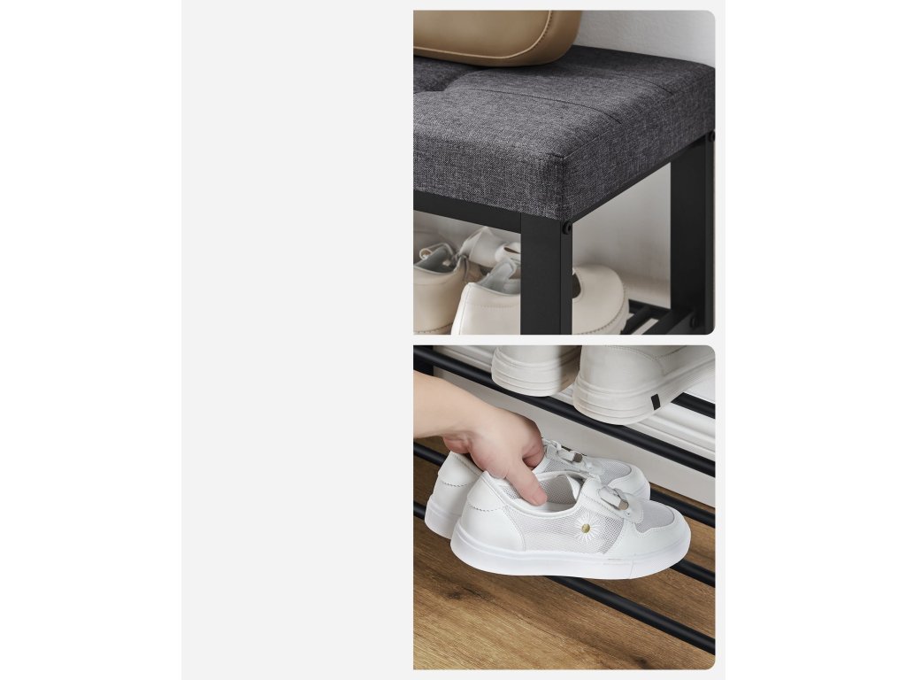 Elegantní lavice, která spojuje pohodlí a praktičnost – tento model do předsíně nabízí nejen měkký čalouněný sedák v šedé barvě, ale také dvě kovové mřížkované police pro přehledné uložení obuvi. Pevná kovová konstrukce v černém provedení zajišťuje stabilitu i dlouhou životnost, zatímco jednoduchý a moderní design se snadno přizpůsobí různým interiérům. Ideální řešení pro každého, kdo hledá funkční a stylový kousek nábytku, který zpříjemní každodenní přezouvání a udrží předsíň v pořádku.