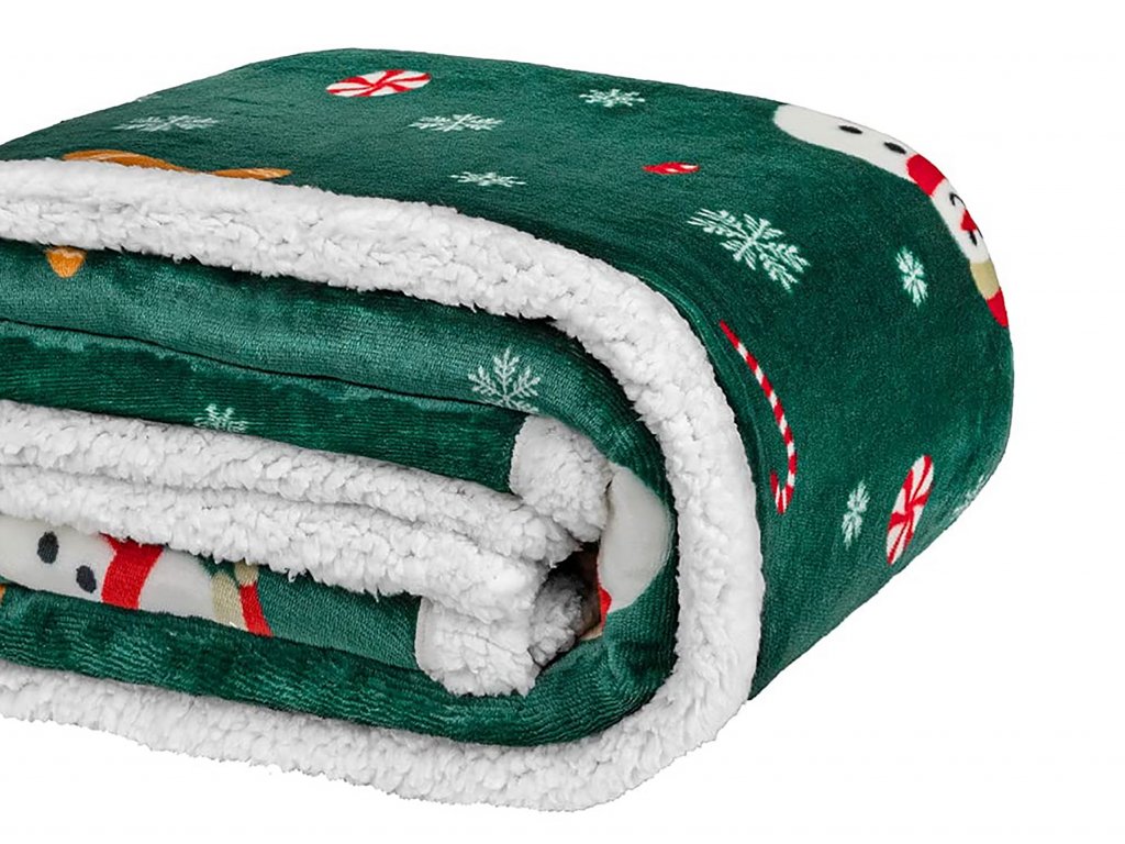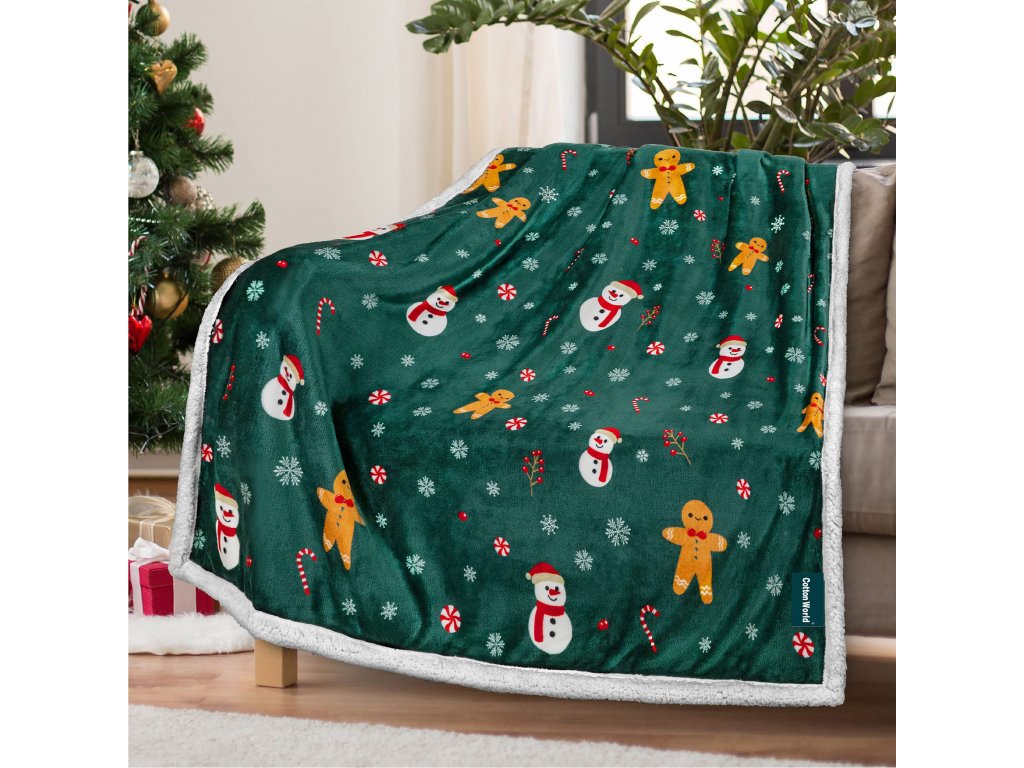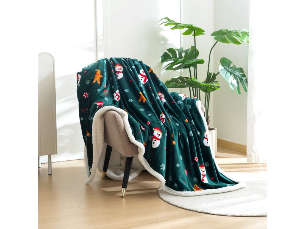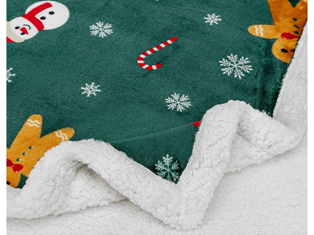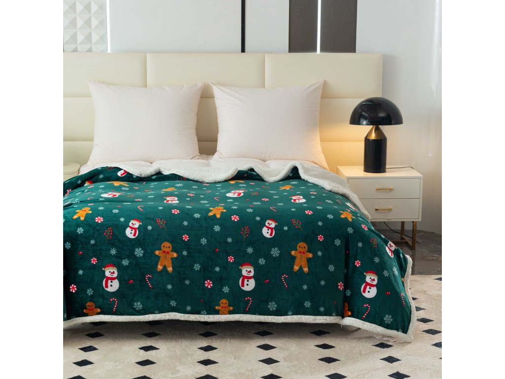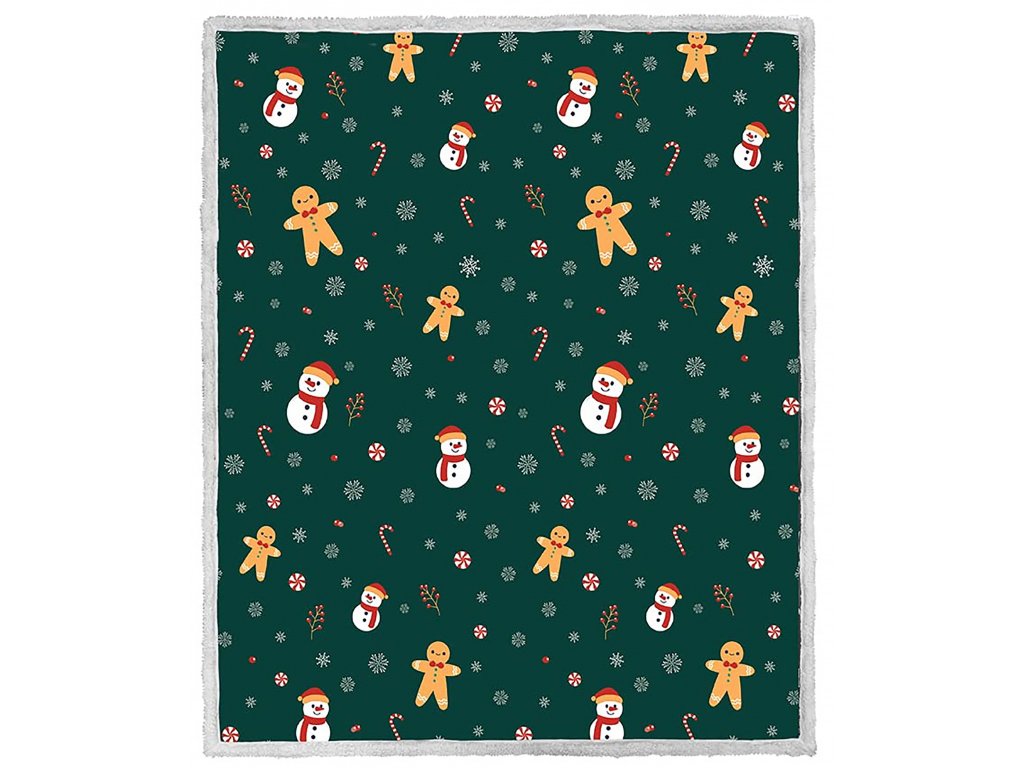 Vánoční tmavě zelená beránková deka z mikroplyše SNĚHULÁK A PERNÍČEK