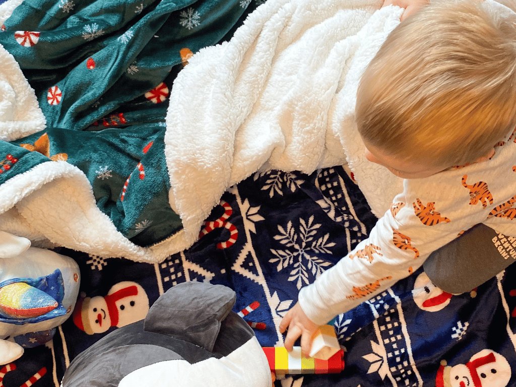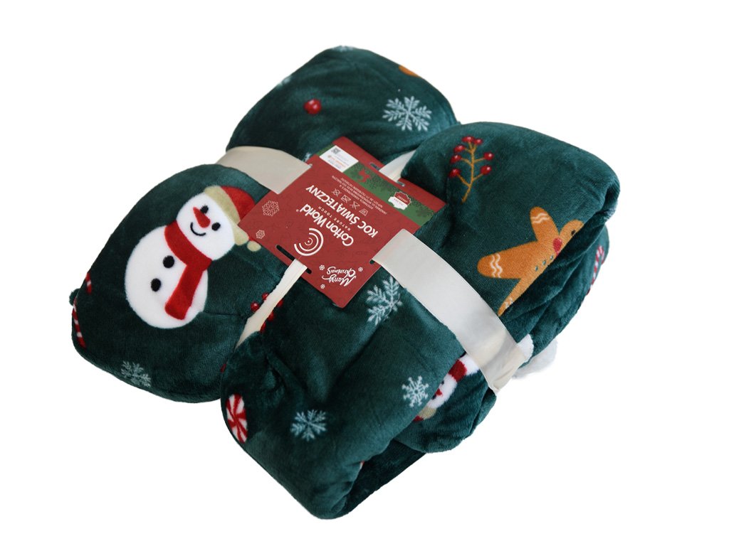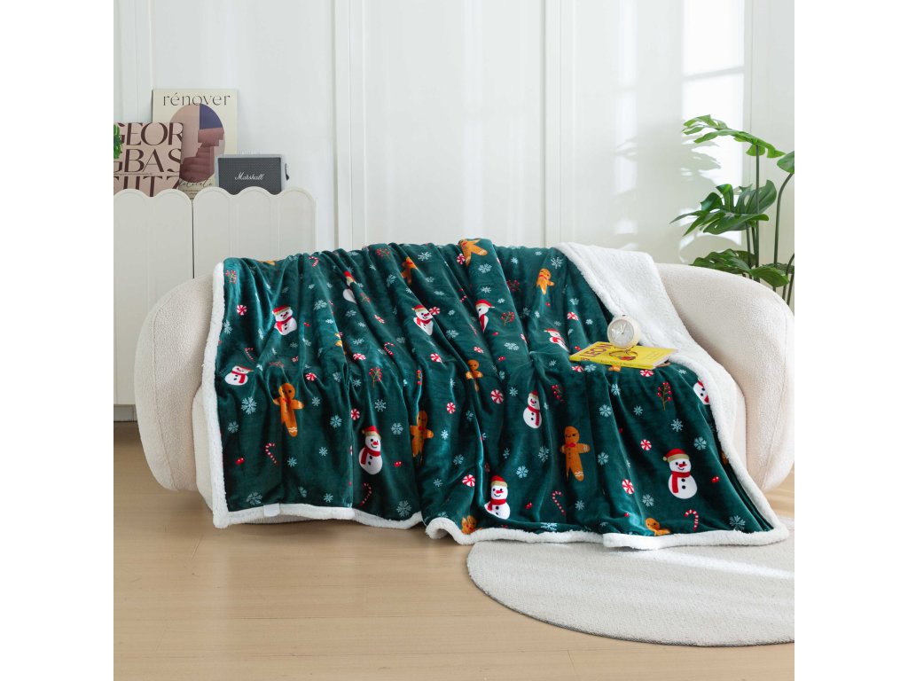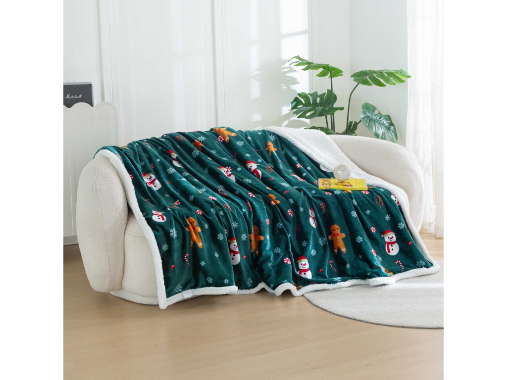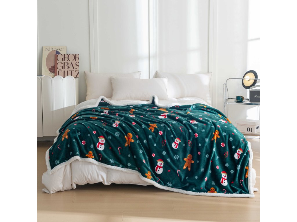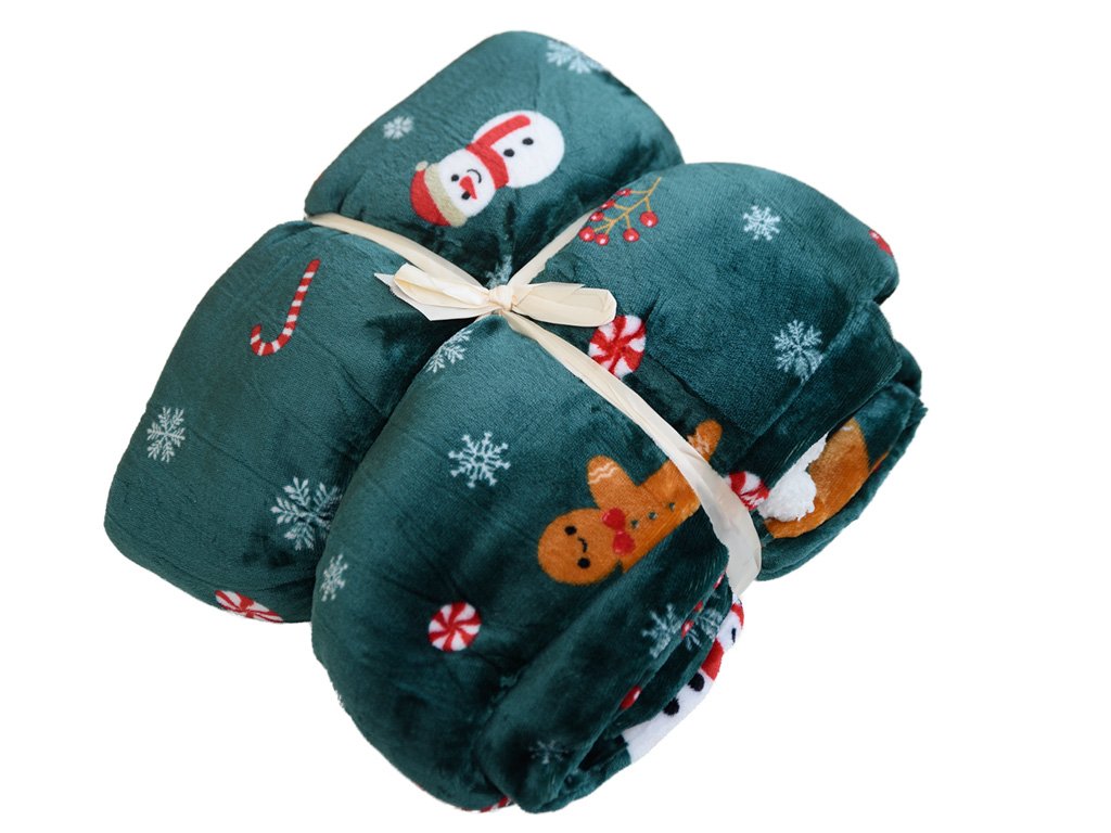 Vánoční tmavě zelená beránková deka z mikroplyše SNĚHULÁK A PERNÍČEK