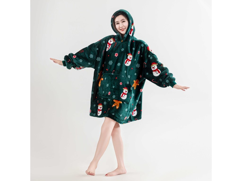 Beránková mikinová deka s rukávy a kapucí SNOWMAN AND GINGERBREAD, zelená