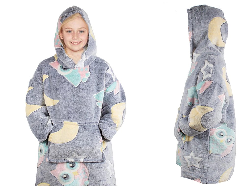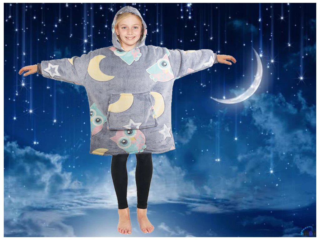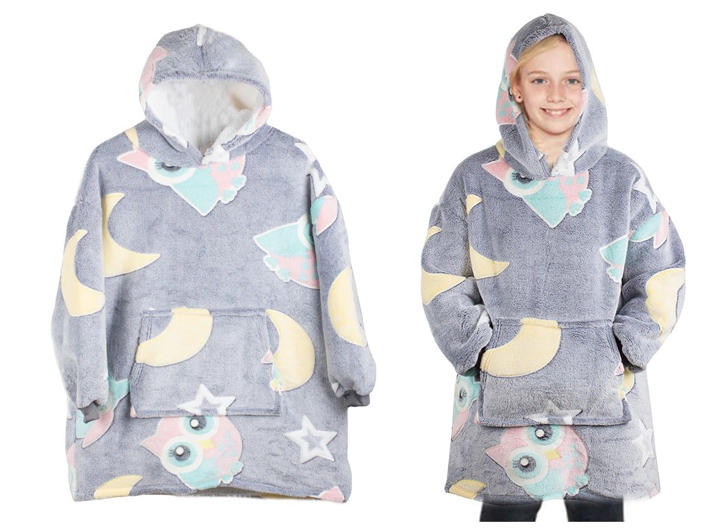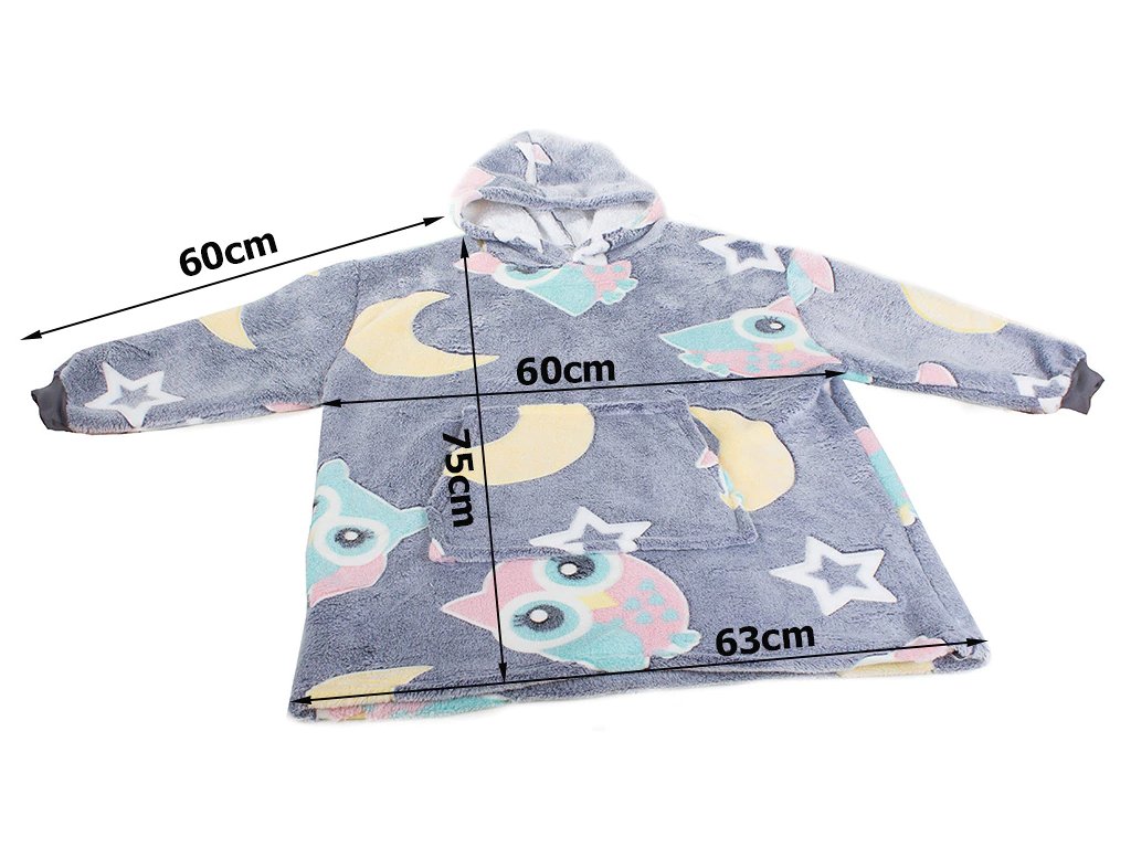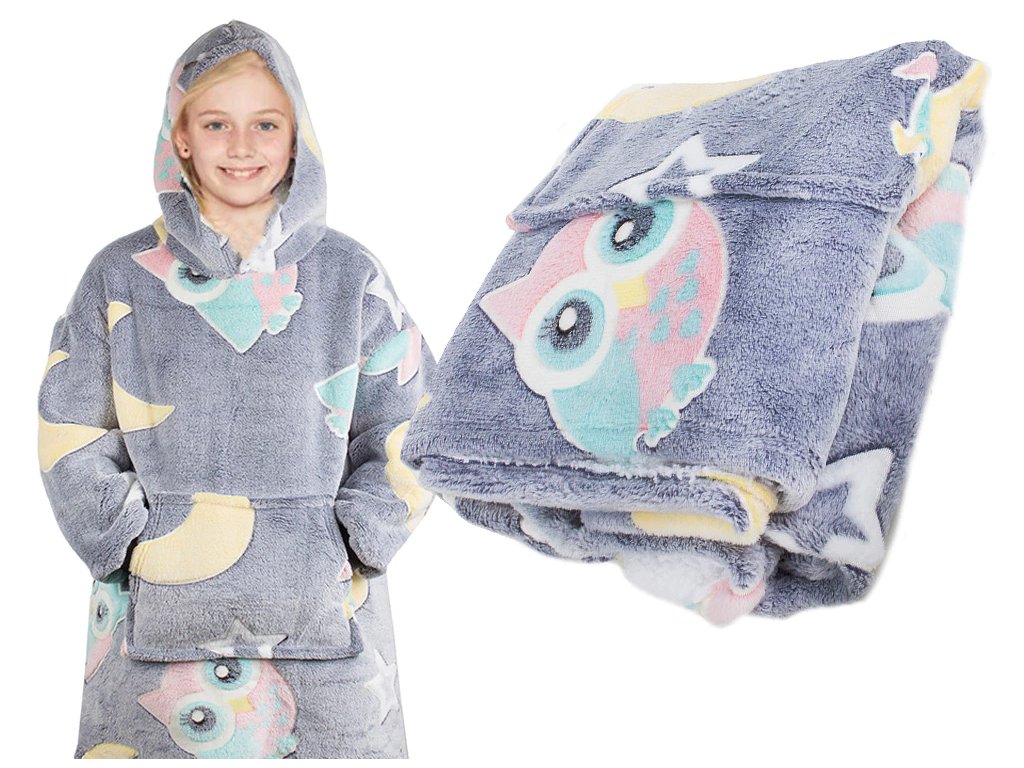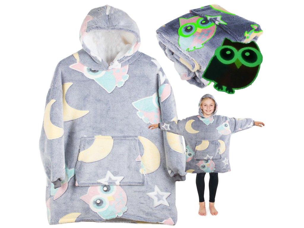 Dětská svítící mikinová deka s rukávy a kapucí SHINING OWL šedá