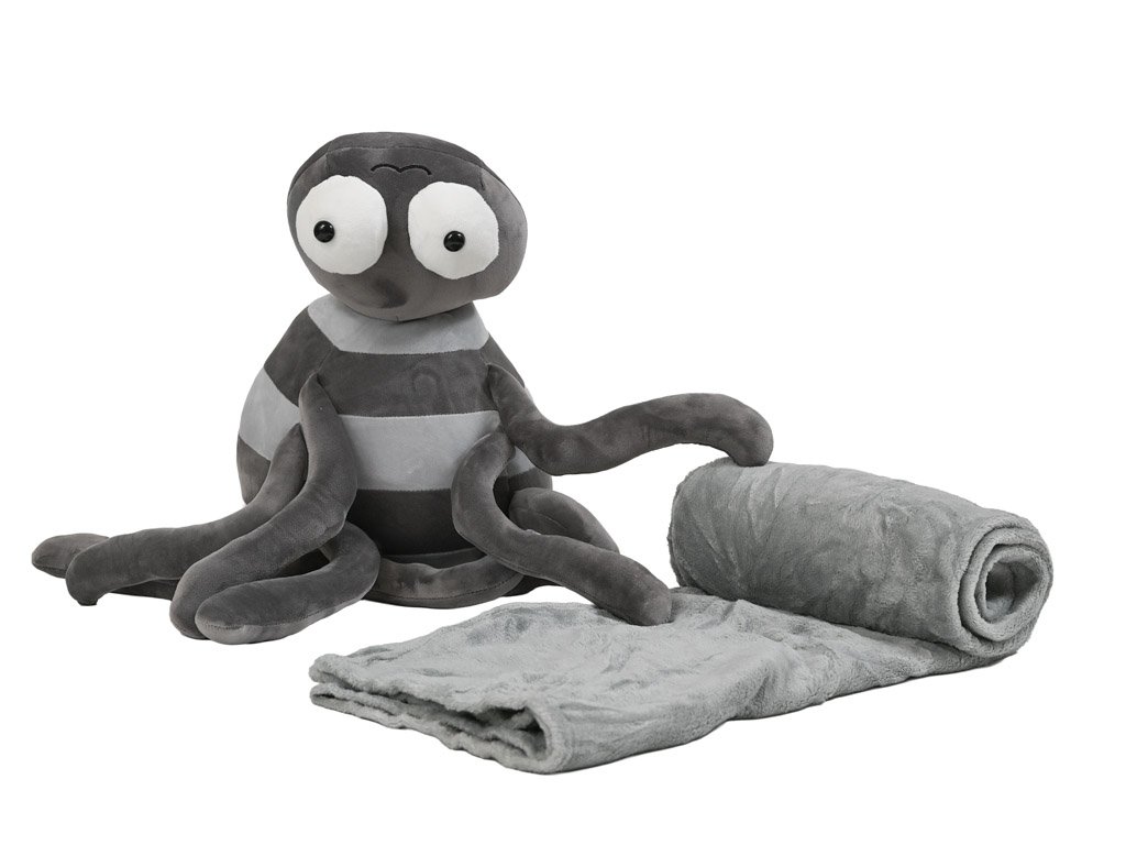 Plyšový pavouk s dekou je netradiční, ale velmi roztomilý společník, který zaujme na první pohled svými vtipně velkýma očima a měkkým tělíčkem. Vyroben je z jemného mikroplyše a ukrývá v sobě měkkou deku o velikosti 100 x 160 cm, kterou snadno vyjmete a opět uložíte. Tato kombinace plyšáka a přikrývky v jednom nabízí nejen pohodlí, ale i zábavu – ideální na doma i na cesty.