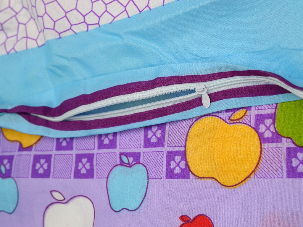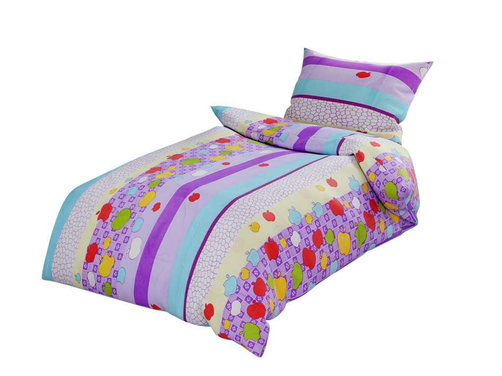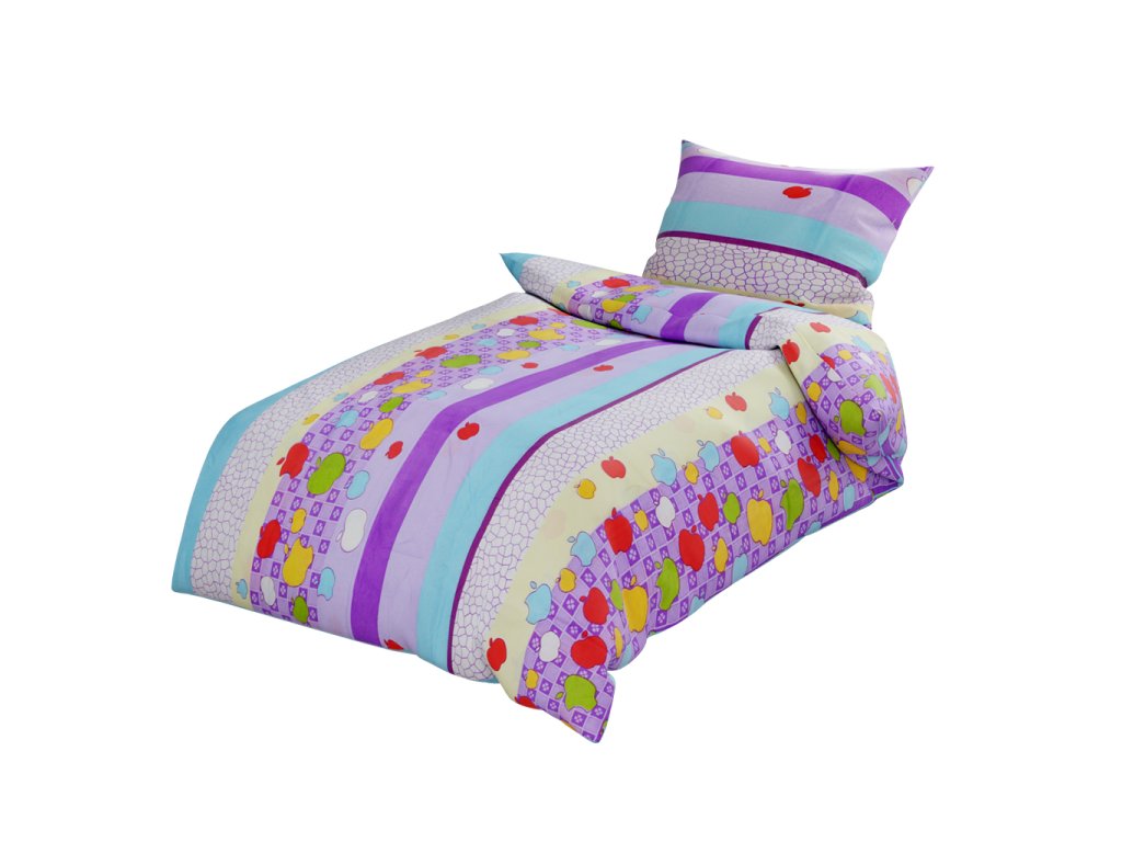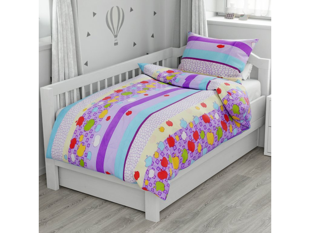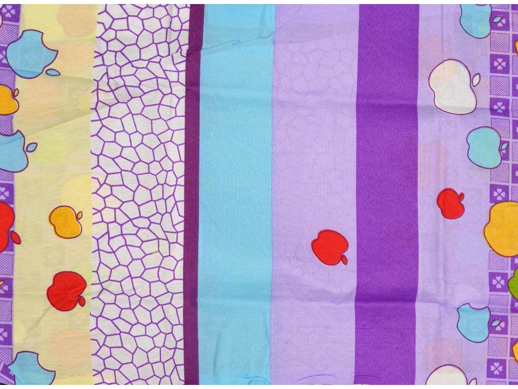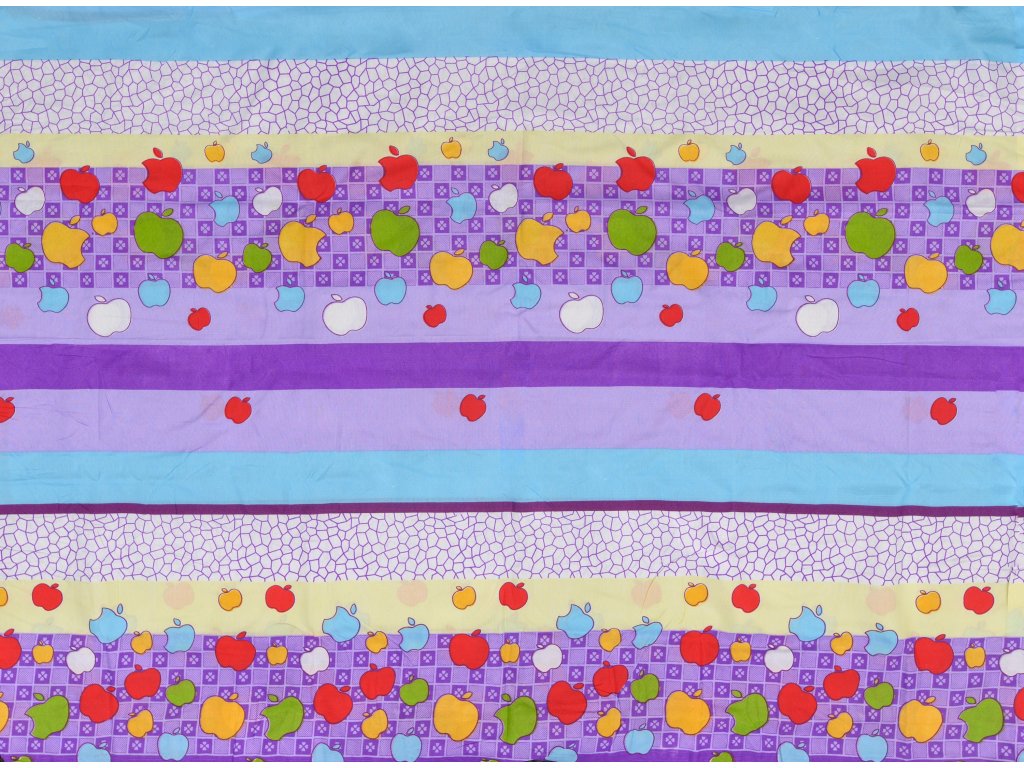 Bavlněné povlečení do postýlky BAREVNÉ PRUHY S JABLKY fialové