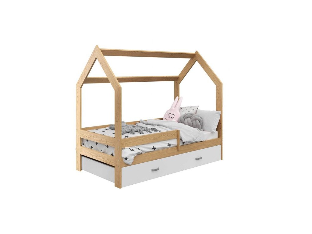 Dětská postel ve tvaru domečku nabízí nejen pohodlné místo ke spánku, ale také útulné zákoutí pro hraní, snění a odpočinek. Přirozená kresba a teplý dekor borovicového dřeva vnáší do interiéru kousek přírody a klidu. Postel lze snadno ozdobit lehounkými závěsy, jemnými světýlky nebo hravými dekoracemi, díky čemuž vytvoříte prostředí plné fantazie. Pevná konstrukce a kvalitní zpracování garantují bezpečnost a dlouhodobou spolehlivost, což dělá z této postele ideální volbu pro každého malého objevitele.