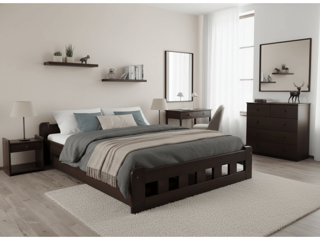 Pro milovníky tmavších odstínů je ideální dekor ořechu. Postele v ořechové barvě připomínají barvu hořké čokolády. V interiéru ložnice působí dominantně a vkusně. Moderně působí kontrast světlého interiéru v krémových nebo bílých odstínech s postelí v přírodní barvě ořechu.