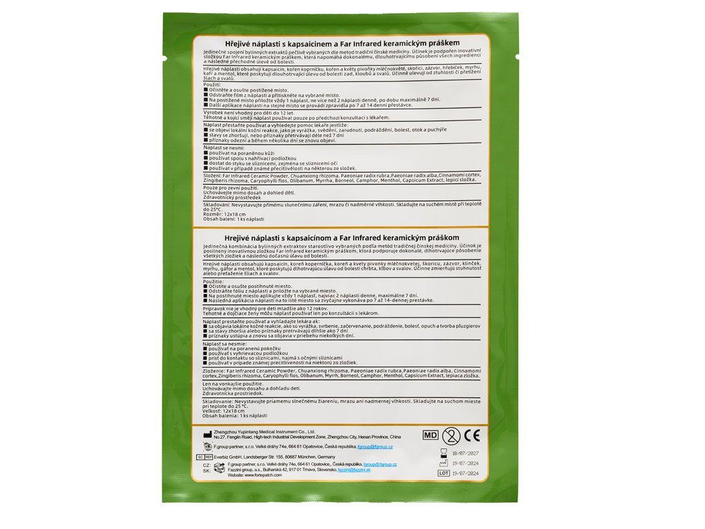 Hřejivá náplast s kapsaicinem a Far Infrared keramickým práškem 12x18cm