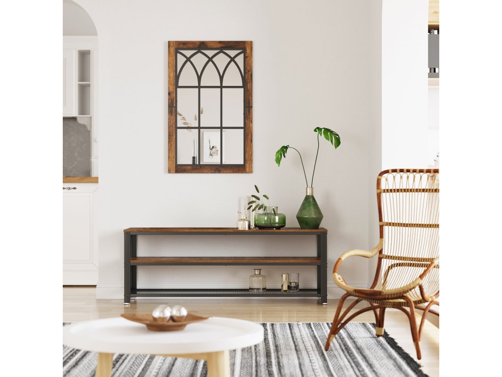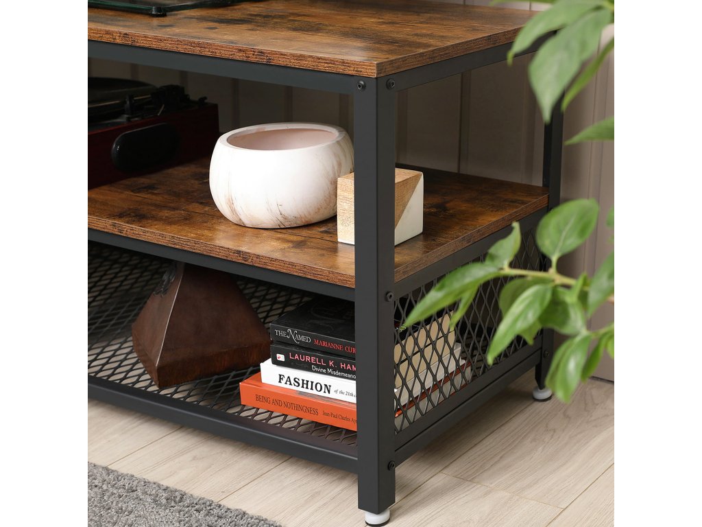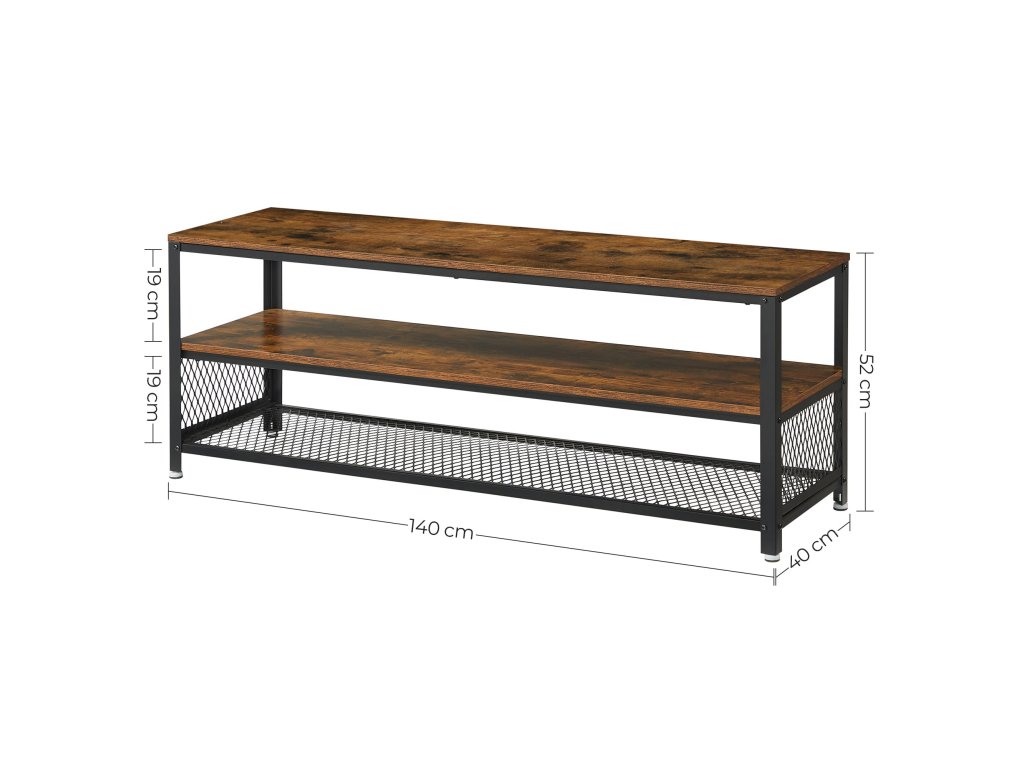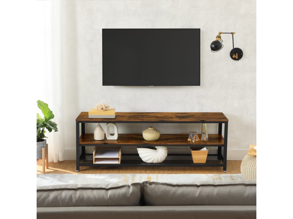 Stylový TV stolek s rustikálním povrchem a industriálními prvky se skvěle hodí nejen pod televizi, ale také jako úložný prostor v obývacím pokoji, předsíni nebo pracovně. Kombinace teplého dřeva a kovu dodává interiéru útulnost i moderní nádech. Jeho prostorné police využijete na dekorace, knihy, elektroniku nebo třeba květiny. Skvělý doplněk, který propojí praktičnost s estetikou.