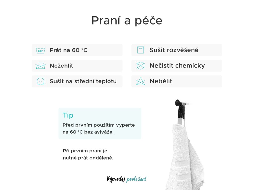 Chcete, aby vaše ručníky byly stále jemné a měkké?! Důležitá je správná péče o daný produkt. Ručníky doporučujeme před prvním použitím vyprat při teplotě 40 °C, poté usušit ve visu nebo v bubnové sušičce na normální, spíše nižší teplotu. Ručníky se nesmí čistit chemicky, ani bělit. Žehlení se nedoporučuje z důvodu možného poškození smyček, materiál by ztratil savost a svoji jemnost.
