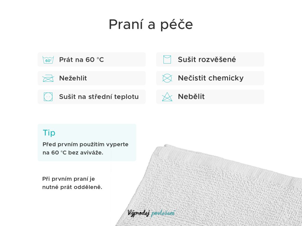 Chcete, aby vaše ručníky byly stále jemné a měkké?! Důležitá je správná péče o daný produkt. Ručníky doporučujeme před prvním použitím vyprat při teplotě 40 °C, poté usušit ve visu nebo v bubnové sušičce na normální, spíše nižší teplotu. Ručníky se nesmí čistit chemicky, ani bělit. Žehlení se nedoporučuje z důvodu možného poškození smyček, materiál by ztratil savost a svoji jemnost.