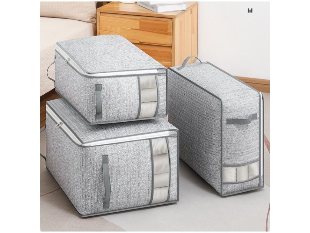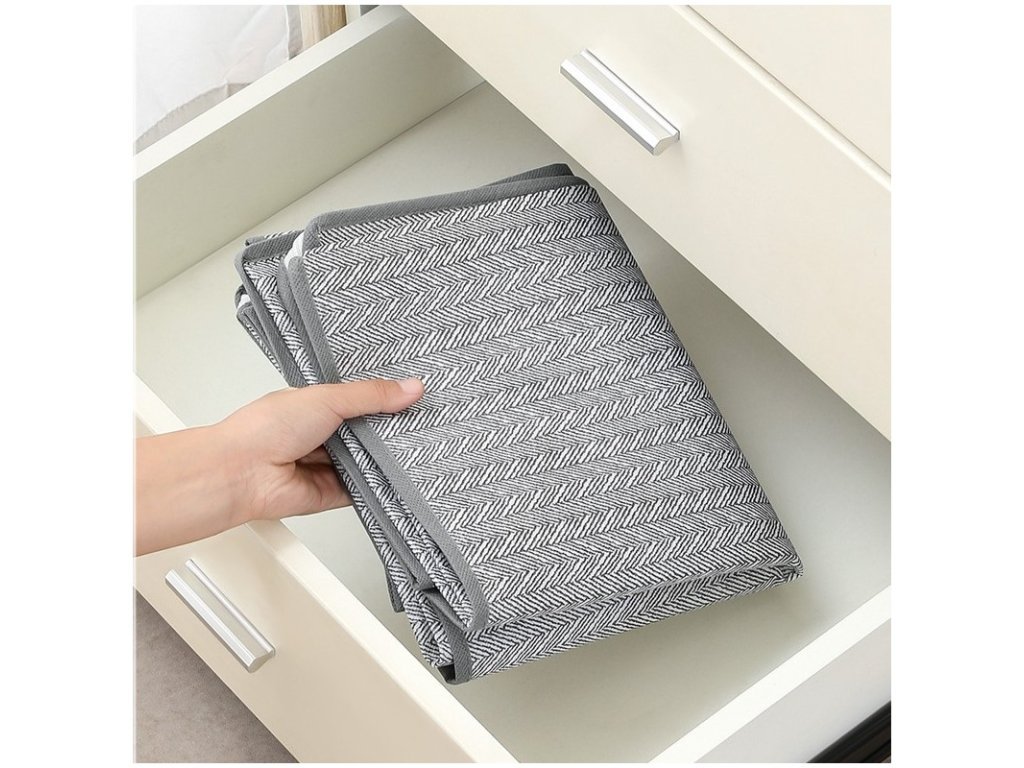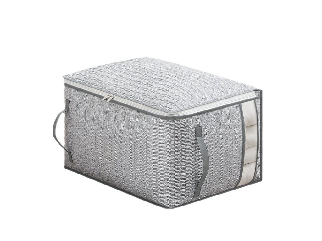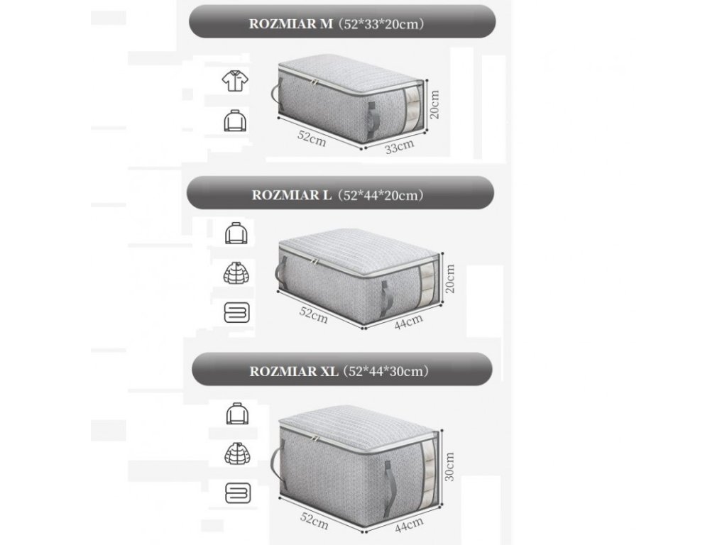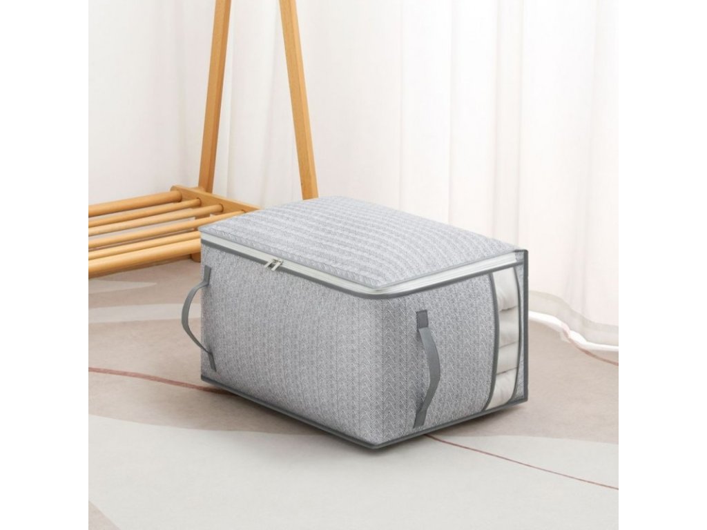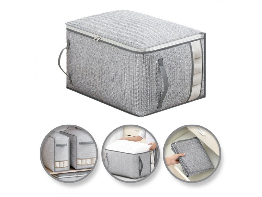 Box je vyroben z prodyšného materiálu, který chrání uložené věci před prachem a vlhkostí. Má robustní zip, který umožňuje snadný přístup k obsahu, a po stranách jsou praktické úchyty pro snadnou manipulaci a přenášení.