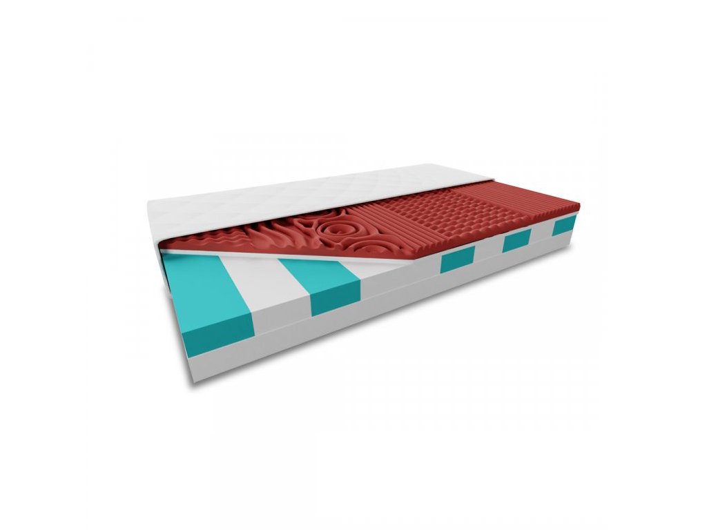 Vrchní část matrace tvoří PUR pěna s výraznou 3D profilací, rozdělenou do 7 anatomických zón. Každá zóna reaguje jinak na tlak – přizpůsobuje se potřebám ramen, beder či nohou a napomáhá tak zdravému uložení těla během spánku. Zónování je přitom dosaženo nejen povrchovým tvarováním, ale i použitím pěn s různou hustotou a tuhostí. Díky tomu matrace přesněji reaguje na váhu jednotlivých částí těla. Střední nosnou část tvoří pružná HR pěna s otevřenou strukturou buněk, která zajišťuje pevnost, odolnost a výborné odvětrávání.