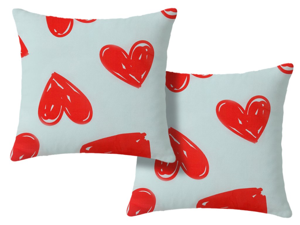Sada 2 ks dekoračních povlaků na polštář WARM HEART 45 x 45 cm ve světle modré barvě s hravým motivem červených srdcí vnese do vašeho interiéru romantiku a veselou atmosféru. Kombinace jemného modrého podkladu a výrazných srdcí působí moderně a svěže. Povlak je vyroben z materiálu, který je příjemný na dotek a zároveň odolný proti opotřebení.