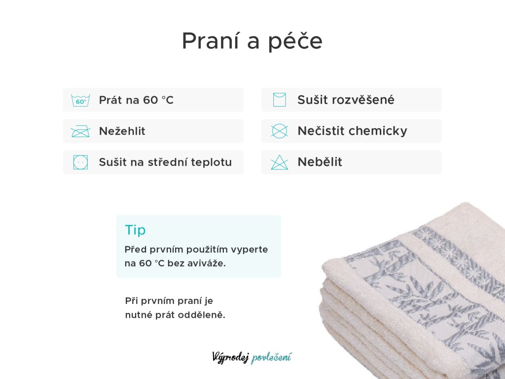 Chcete, aby vaše ručníky byly stále jemné a měkké?! Důležitá je správná péče o daný produkt. Ručníky doporučujeme před prvním použitím vyprat při teplotě 60 °C, poté usušit ve visu nebo v bubnové sušičce na normální, spíše nižší teplotu. Ručníky se nesmí čistit chemicky, ani bělit. Žehlení se nedoporučuje z důvodu možného poškození smyček, materiál by ztratil savost a svoji jemnost.