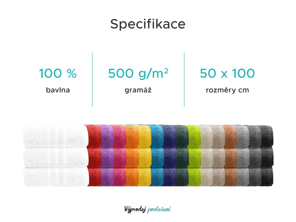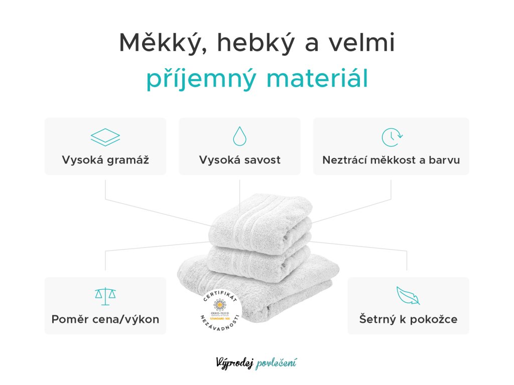 Luxusní ručníky o gramáži 500 g/m2 jsou z kvalitní bavlny, šetrné k pokožce a kůži celého těla. Textilie je silná a vyniká především vysokou savostí a jemností. Ručníky jsou příjemné na omak, tvarově stálé, nadýchané a lehké. Mimořádně hebké ručníky jsou oblíbené v domácnostech, ale i hotelech nebo penzionech.