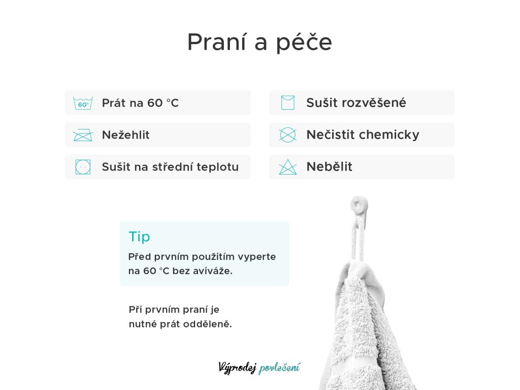 Chcete, aby vaše ručníky byly stále jemné a měkké?! Důležitá je správná péče o daný produkt. Ručníky doporučujeme před prvním použitím vyprat při teplotě 40 °C, poté usušit ve visu nebo v bubnové sušičce na normální, spíše nižší teplotu. Ručníky se nesmí čistit chemicky, ani bělit. Žehlení se nedoporučuje z důvodu možného poškození smyček, materiál by ztratil savost a svoji jemnost.
