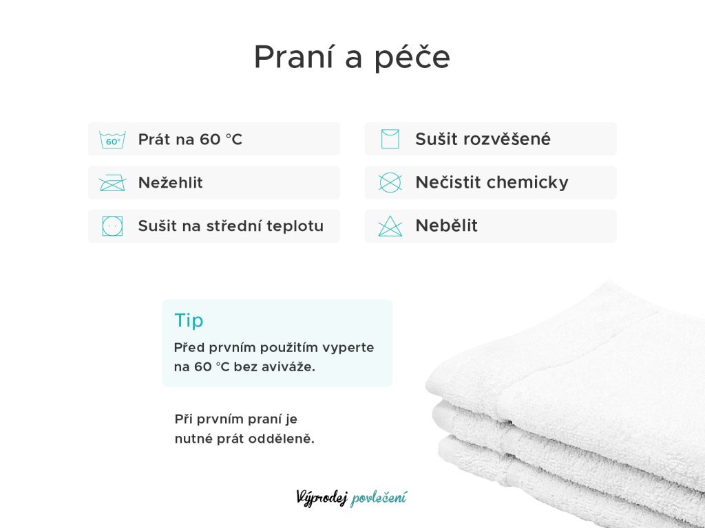 Chcete, aby vaše ručníky byly stále jemné a měkké?! Důležitá je správná péče o daný produkt. Ručníky doporučujeme před prvním použitím vyprat při teplotě 60 °C, poté usušit ve visu nebo v bubnové sušičce na normální, spíše nižší teplotu. Ručníky se nesmí čistit chemicky, ani bělit. Žehlení se nedoporučuje z možného poškození smyček, materiál by ztratil savost a svoji jemnost.