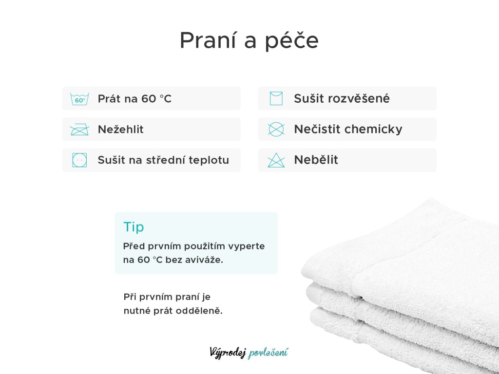 Chcete, aby vaše ručníky byly stále jemné a měkké?! Důležitá je správná péče o daný produkt. Ručníky doporučujeme před prvním použitím vyprat při teplotě 60 °C, poté usušit ve visu nebo v bubnové sušičce na normální, spíše nižší teplotu. Ručníky se nesmí čistit chemicky, ani bělit. Žehlení se nedoporučuje z možného poškození smyček, materiál by ztratil savost a svoji jemnost.