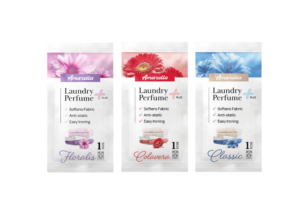 Parfémy na praní AMARELLA v praktickém jednorázovém 10ml sáčku jsou ideálním řešením pro každodenní péči o prádlo i pro použití na cestách či dovolené. Spojují intenzivní vůni s praktickými benefity – dodávají textiliím dlouhotrvající svěžest, jemnost a pohodlí při nošení. Jedna dávka provoní vlákna tak, že oblečení, ručníky i ložní prádlo zůstávají svěží po usušení i během nošení. Navíc působí antistaticky, usnadňují žehlení a pomáhají omezit pomačkání. Jednorázové balení je připraveno k okamžitému použití a poskytuje rychlý způsob, jak mít prádlo krásně voňavé a upravené kdykoli a kdekoli.