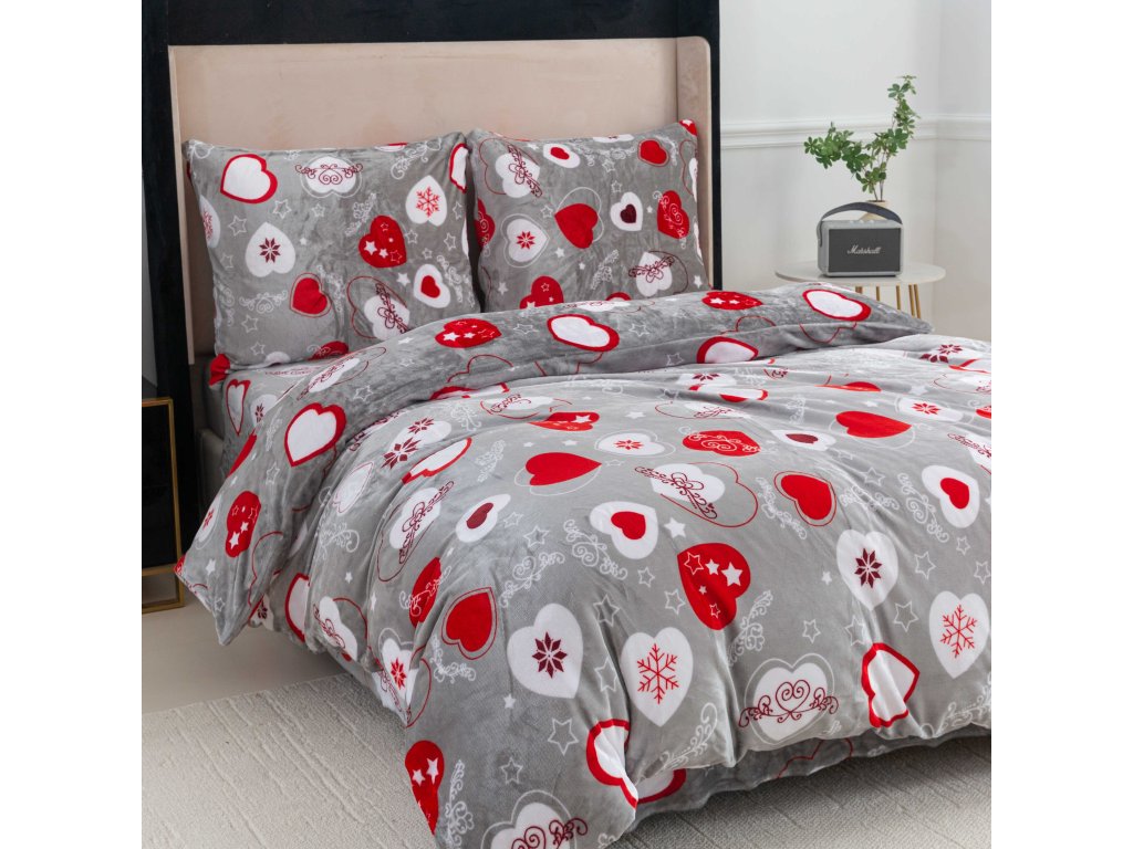 Sada 2ks mikroplyšového povlečení VÁNOČNÍ SRDCE šedé + prostěradlo mikroplyš SOFT 180x200 cm bílé, dvoulůžko