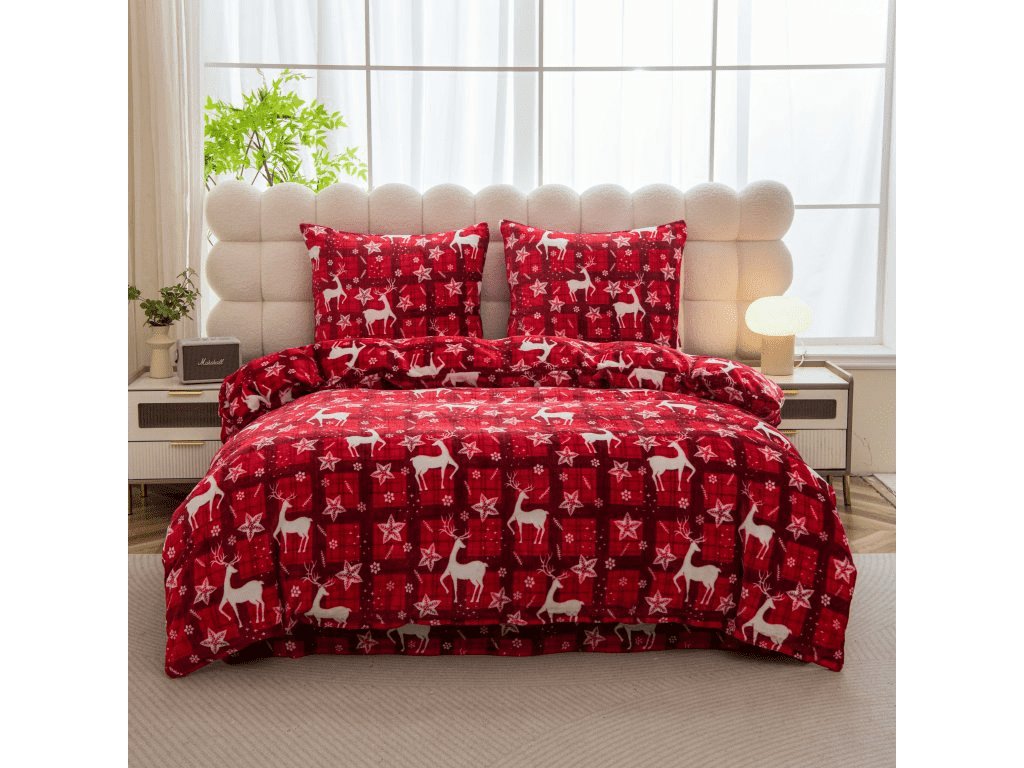 Sada mikroplyšového povlečení VELVET CHRISTMAS červené + prostěradlo mikroplyš SOFT 180x200 cm bílé, dvoulůžko