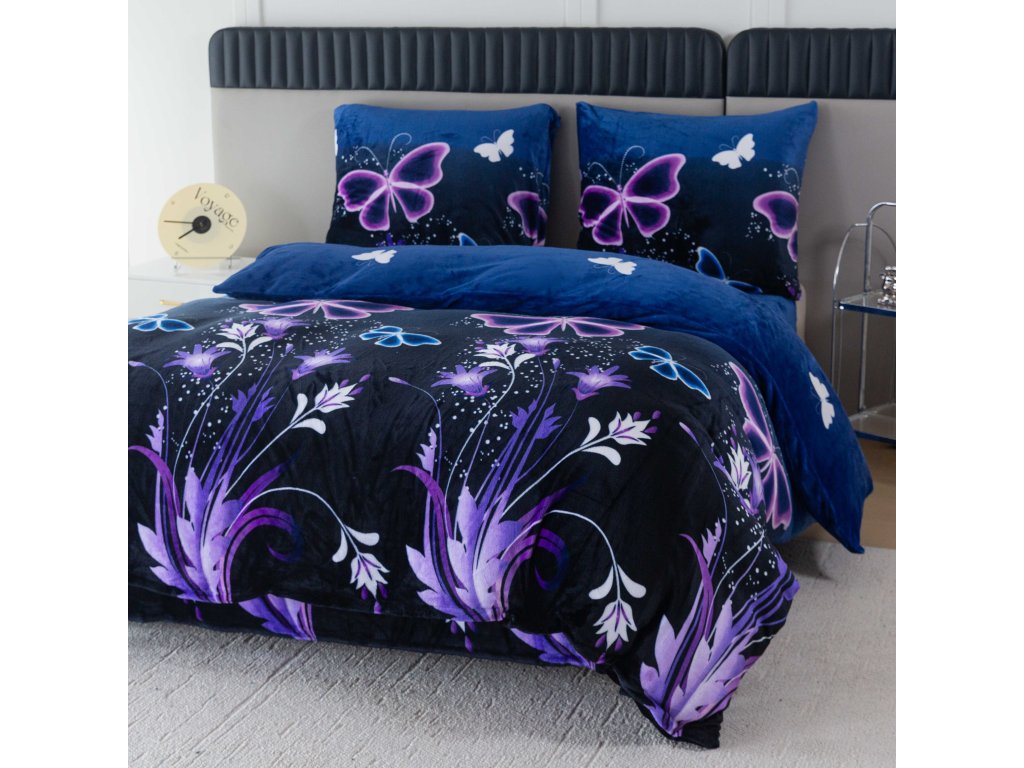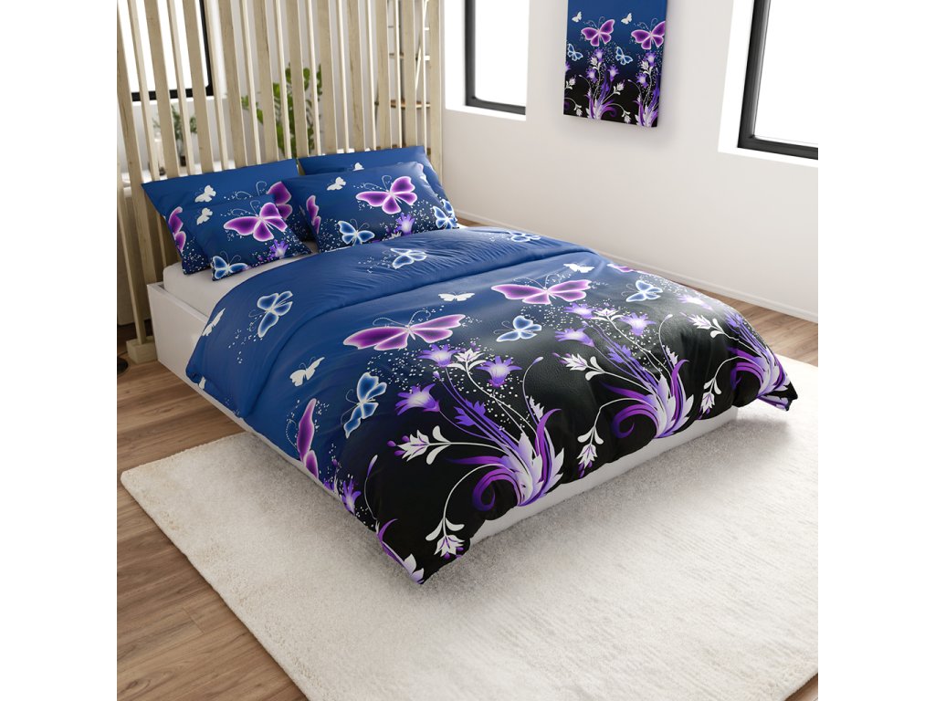 Sada mikroplyšového povlečení VIOLET BUTTERFLY tmavě modré + prostěradlo mikroplyš SOFT 90x200 cm bílé, jednolůžko